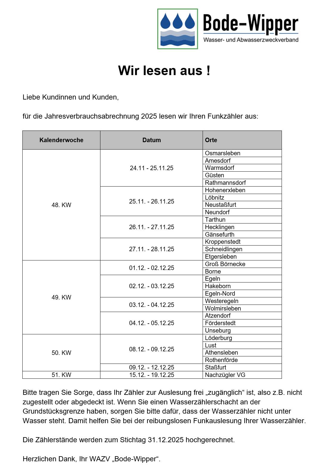 Ablesung der Funkzähler By Andreas Beyer 12.11.202512.11.2025 Hinweis: Sollten Sie zu den wenigen Haushalten gehören, die noch keinen Funkzähler haben (Umstellung bis Ostern 2026 geplant), erhalten Sie wie gewohnt eine Ablesekarte.